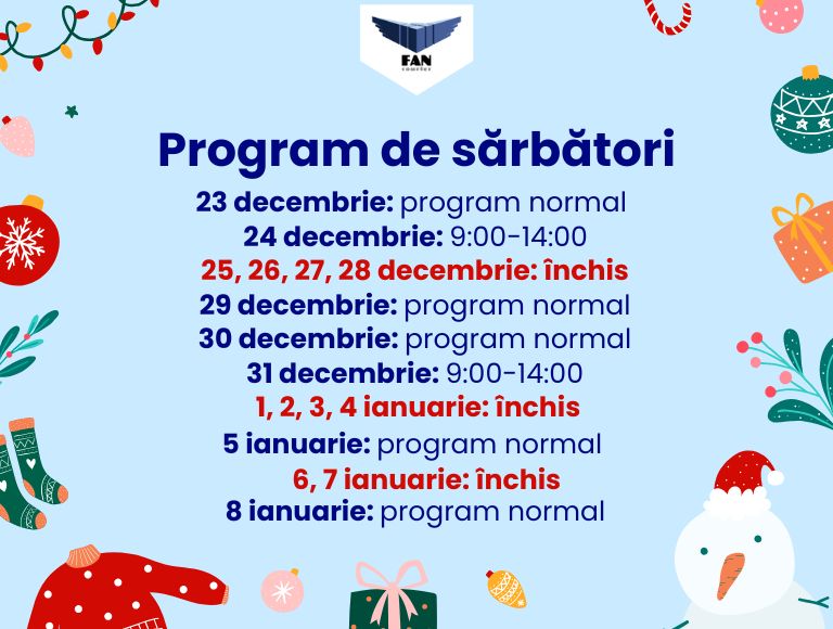 Pentru a ne bucura de magia sărbătorilor, livrările și ridicările se vor face după un program special. Punem pauză pentru a sărbători Crăciunul pe 25 și 26 decembrie, ne încărcăm bateriile la trecerea dintre ani pe 1 și 2 ianuarie și ne mai oprim puțin pe 6 și 7 ianuarie.